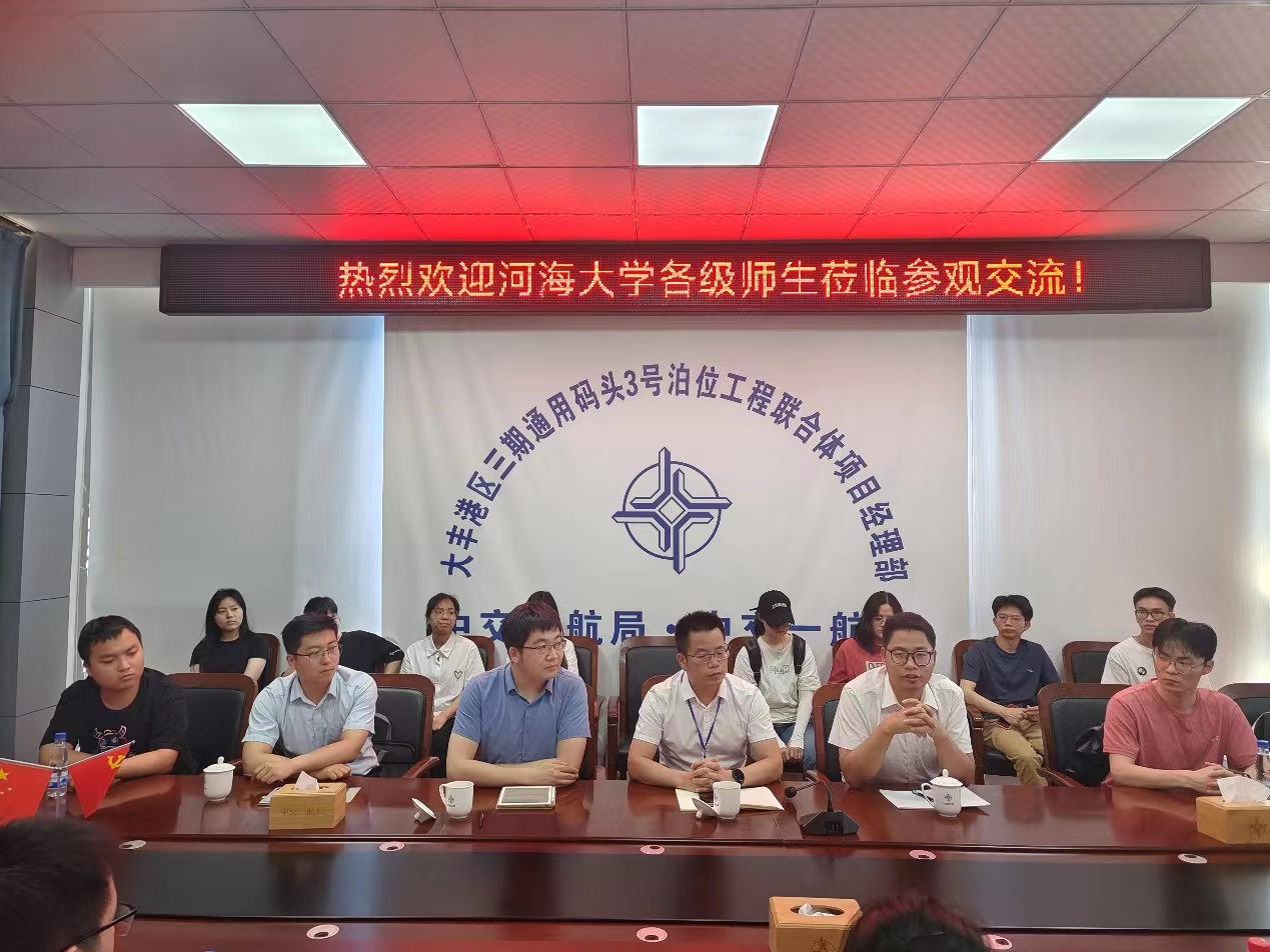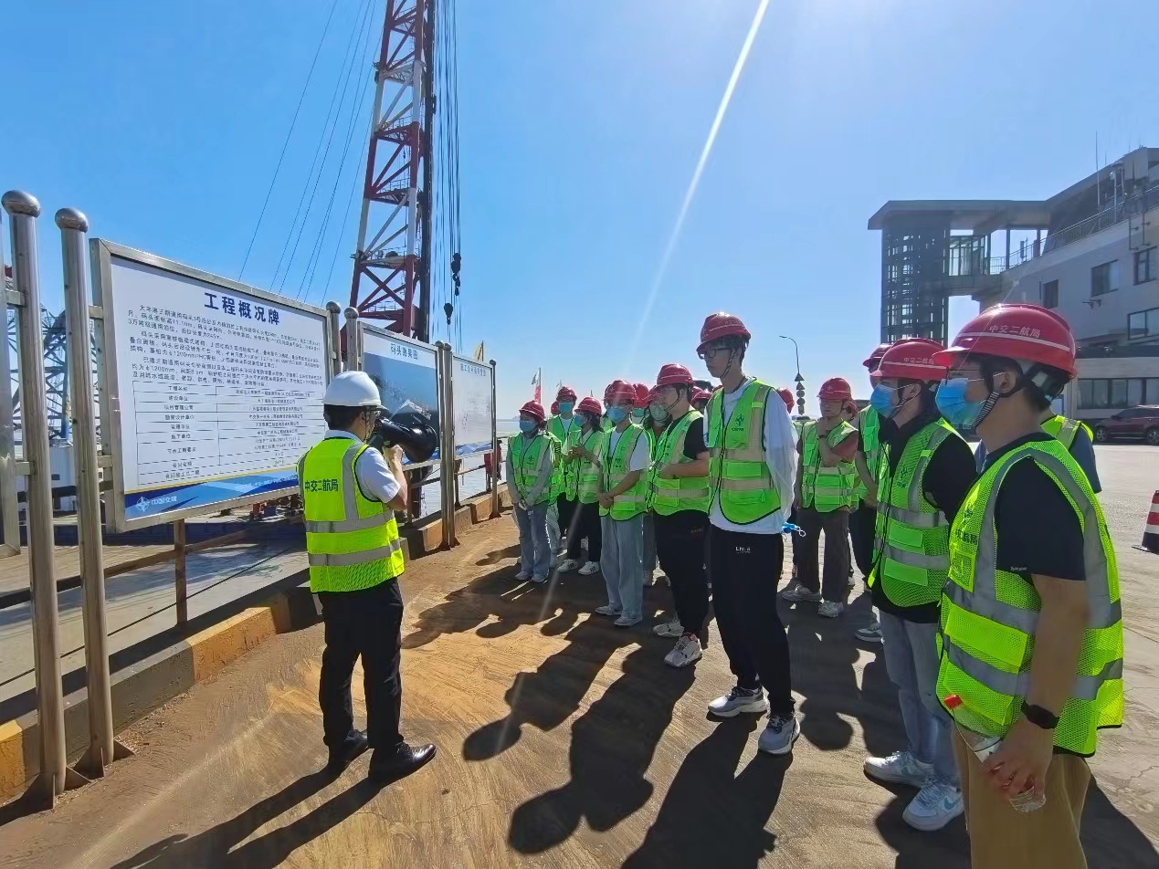 然后,师生一行在企业的带领下,赴项目建设一线参观,听取项目经理与项目副经理、安全总监对目前项目的建设现状的介绍,实地观摩码头的运行状态和岸桥等港口机械,对工程项目建设与港口水工建筑物有了更为具体的认知。