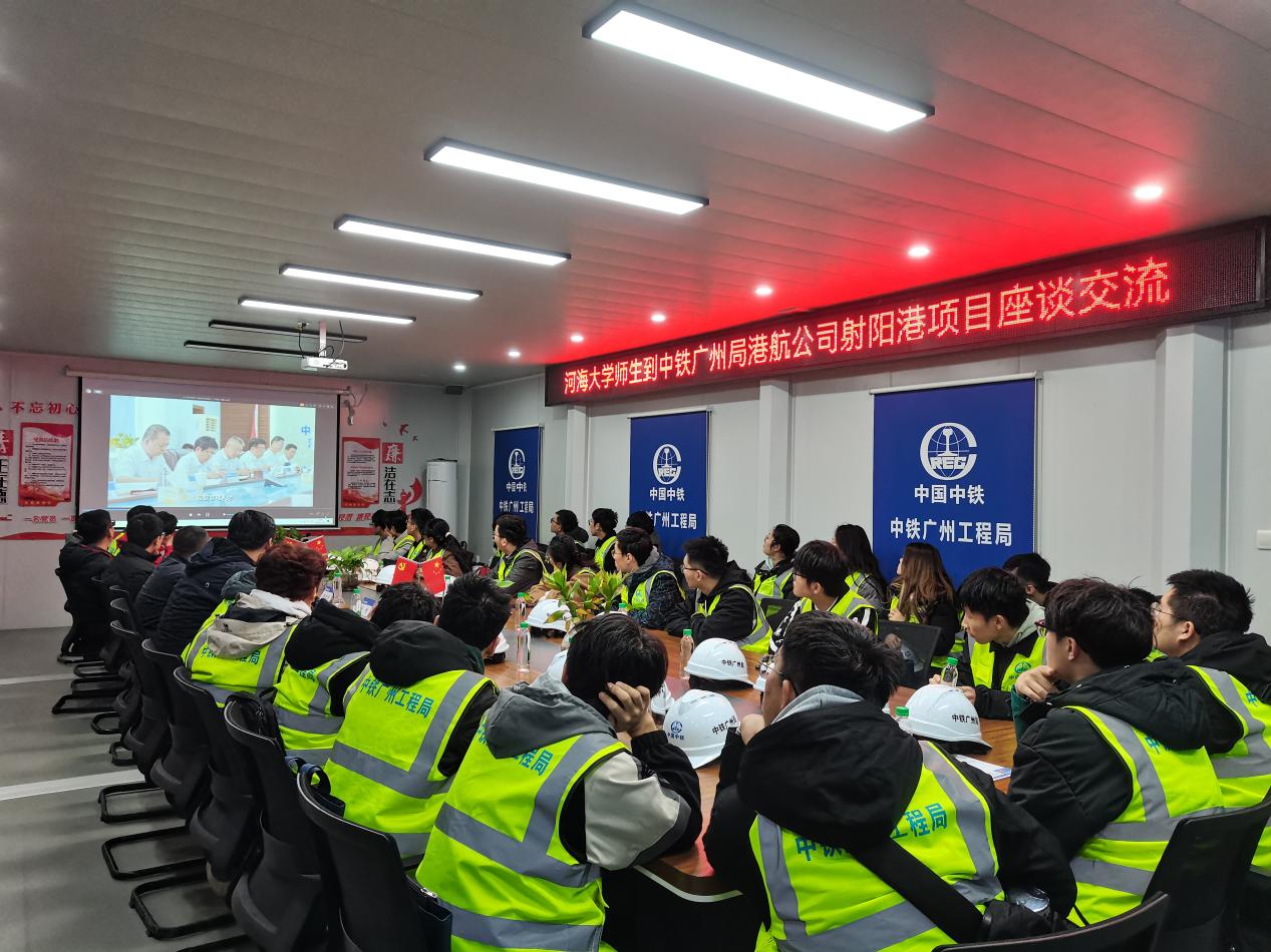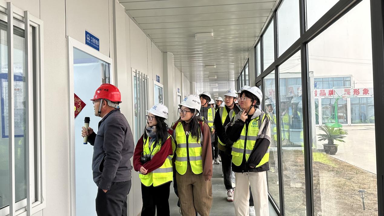 在项目工作人员的引导下,师生参观了工程项目部,并观看了中铁广州局港航公司的宣传视频及现场施工的纪实视频。项目副总经理赵晓磊介绍了基本信息、施工平面布置、项目结构形式等项目概况、施工总体部署及施工工艺、项目进展情况、团队文化、企业在建重点项目。