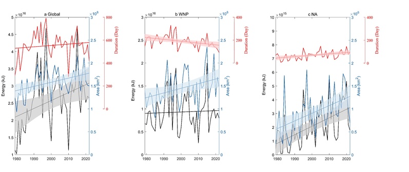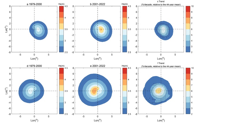 草莓视频 河口海岸综合治理与保护研究团队与英国雷丁大学和帝国理工大学研究人员合作,在利用最新的浮标和卫星观测数据充分验证再分析波浪数据ERA5的基础上,通过定义台风浪波高阈值,提取全球波浪场中的台风浪分布特征,分析了1979-2022年台风引起的全球波高极值、影响面积和累积波浪能的变化趋势,推导了累积波能各项贡献率计算公式。研究发现近44年全球台风引起的波高极值增长明显,为0.32%/a,影响面积扩展速率为0.57%/a,累积波浪能增加速率为0.9%/a。全球台风浪累积波能的增加速率是波高增长速率的3倍,这由台风浪影响面积的扩展所主导。全球不同海区台风浪变化趋势差异明显,对于西北太平洋,波高极值和影响面积的增长速率快于全球,为0.41%/a和0.69%/a;但是累积波能的增长趋势不明显,这是由于西北太平洋年平均台风作用时间减少所致。