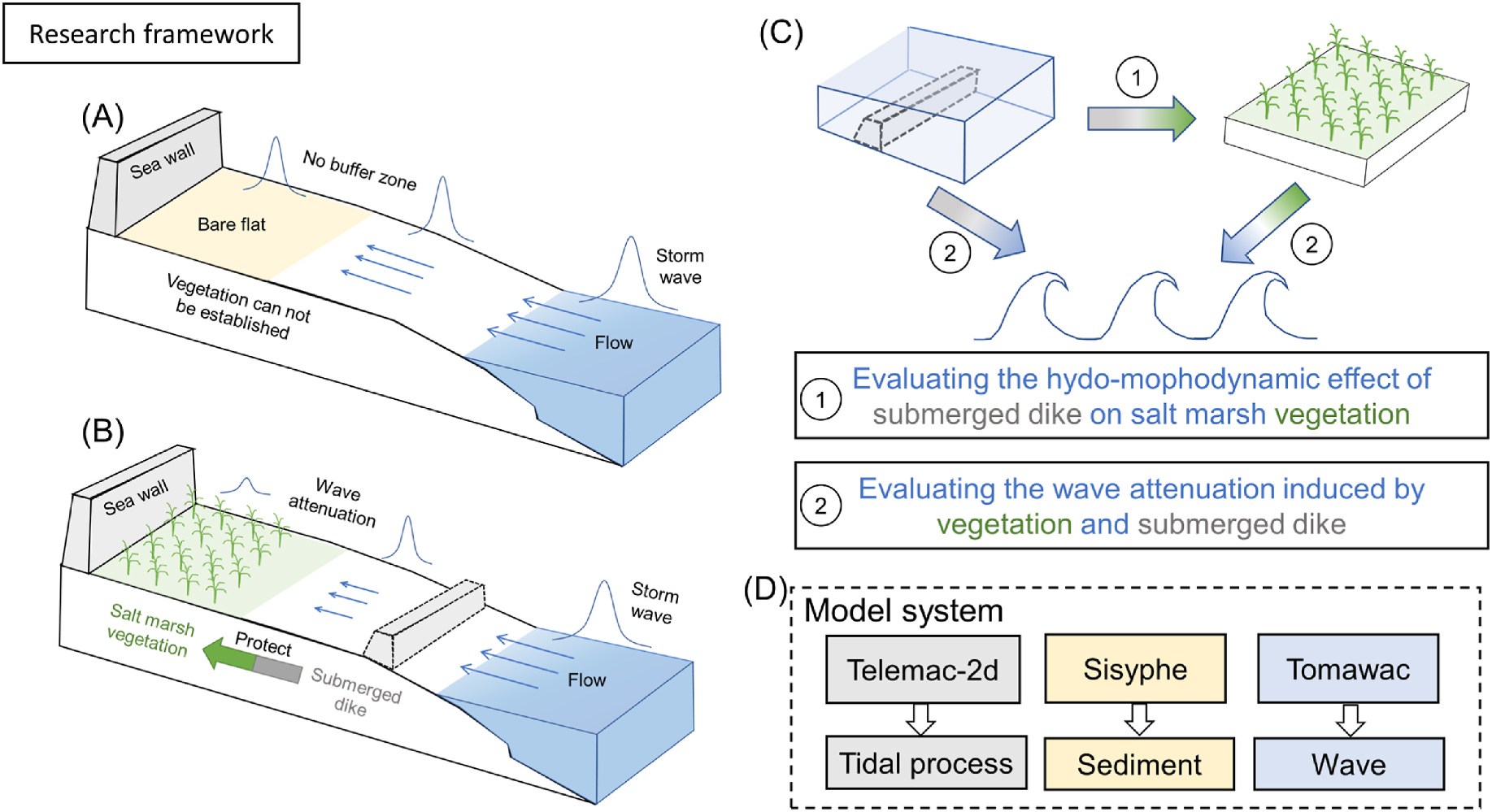 图1 基于自然的混合海防系统空间布局(A)、研究问题(B)、模型框架(C)