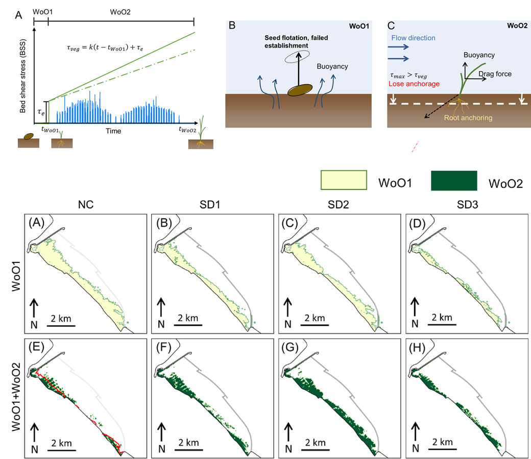 潮间带上复杂的波浪与潮流动力环境为重建盐沼湿地带来了重大挑战。将人工结构与盐沼相结合是一种新型的混合海岸保护策略(图1)。然而,目前此方案在实际盐沼恢复项目中的适用性尚不明确,以及该混合海防系统能否提供有效的波浪衰减效益仍有待进一步研究。研究基于可控潮汐通道海岸带保护修复与防灾减灾协同增效技术,以全国首批江苏首个海岸带保护修复工程(江苏南通海岸带保护修复工程项目)为研究对象,项目旨在通过在近岸建造潜堤为恢复盐沼湿地创造理想的动力环境,并增强整体减灾能力。研究采用了自由表面流模拟系统TELEMAC来模拟波浪、水动力和泥沙过程;基于此,采用机会之窗(WoO)模型预测了SMR实施后的种子与幼苗建立成功率(图2);采用TOMAWAC模型量化了盐沼植被和潜堤的波浪衰减效应。结果表明,具有适当堤顶高程的潜堤有利于盐沼恢复项目,潜堤与盐沼植被的结合显著提升了近岸波浪衰减。这项研究量化了一种新的混合海岸防护策略的影响,该策略的运用有助于实现盐沼恢复和海岸减灾协同增效,为未来海岸带生态修复工作提供新的视角。