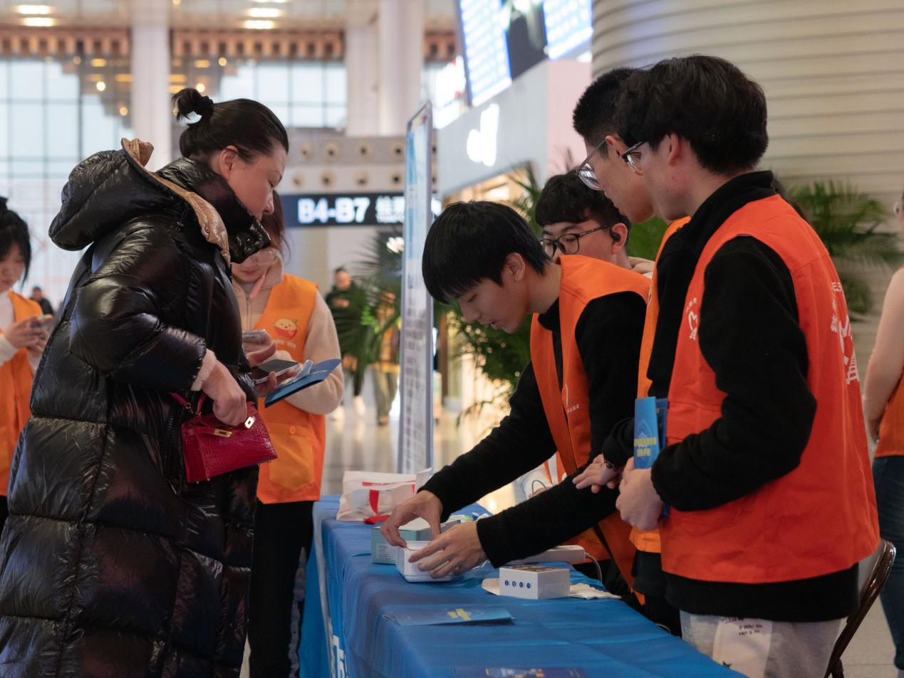 除去负责摊位的志愿者,剩余志愿者们分散在南京南站各处,帮助有需要的旅客。志愿者们主动上前询问旅客是否需要帮助,帮助行李过多的旅客拿行李,带领旅客前往正确的检票口。在旅客们主动向志愿者们寻求帮助时,志愿者们耐心地回答旅客们的问题,帮助行李过多的旅客看管行李。志愿者们也认真帮助特殊的旅客,如帮助盲人旅客拿行李并指引到候车地点,帮助坐轮椅的残疾旅客抵达指定候车点。