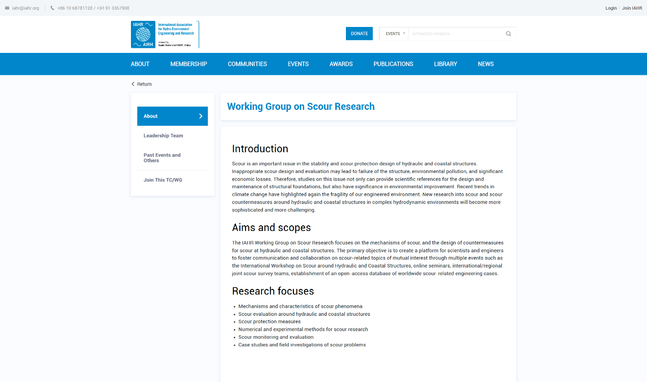 基础冲刷是影响水利和海岸工程安全的重要因素。随着全球气候变化、河流入海泥沙减少、建设条件更加陌生复杂等自然环境,基础冲刷问题变得更加复杂和具有挑战性。IAHR冲刷研究工作组聚焦水利和海岸工程建筑物基础冲刷机理以及冲刷防护措施的相关研究与应用,旨在为科学家和工程师创建一个开放平台,通过多种学术活动促进与冲刷研究有关的主题交流和合作,建立冲刷相关工程案例全球数据库,推动全球水利与海岸工程安全领域的创新发展。