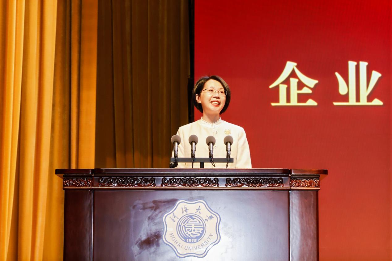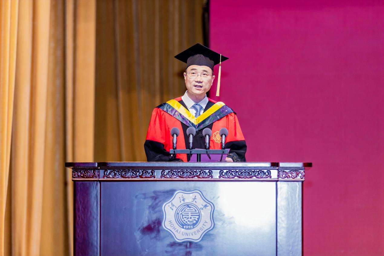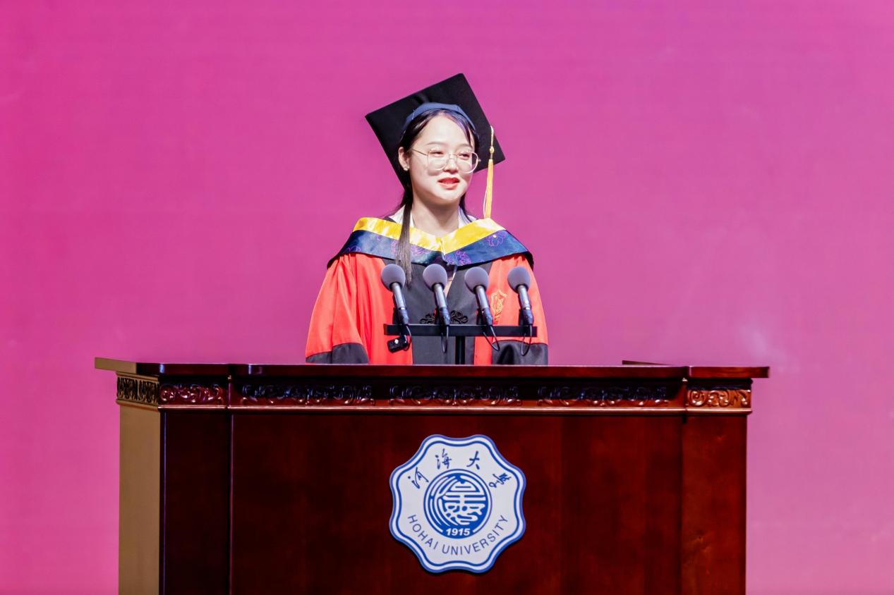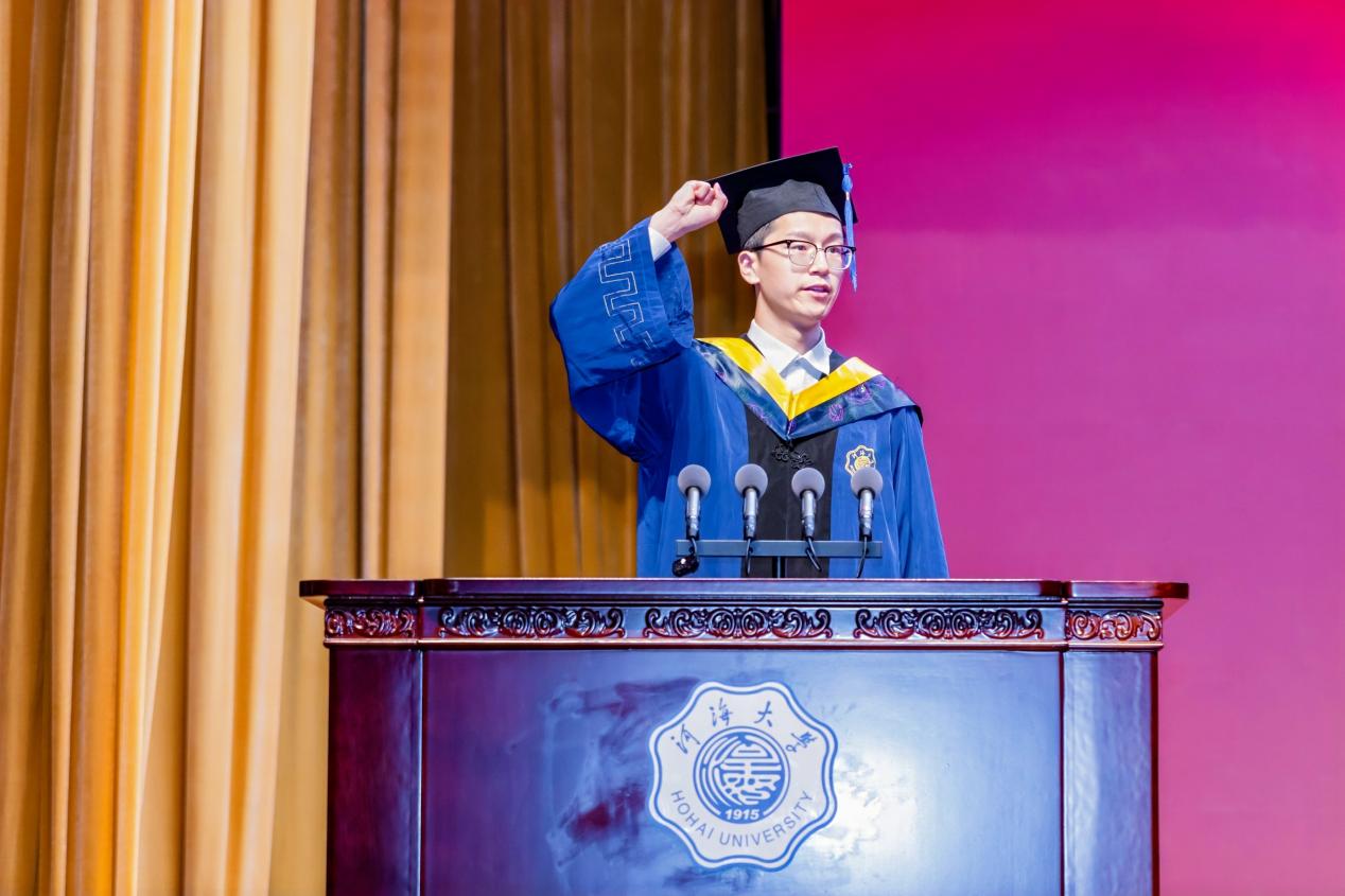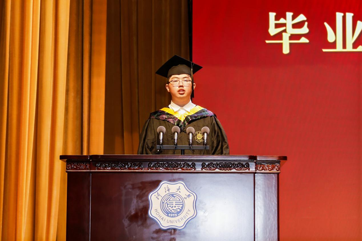2020级本科生陈家骥作为学生代表发言,他向母校、老师、企业、亲朋好友表达了感谢,号召同学们牢记“大哉河海奔前程,毋负邦人期”的嘱托,以实际行动回报祖国、学校和社会。