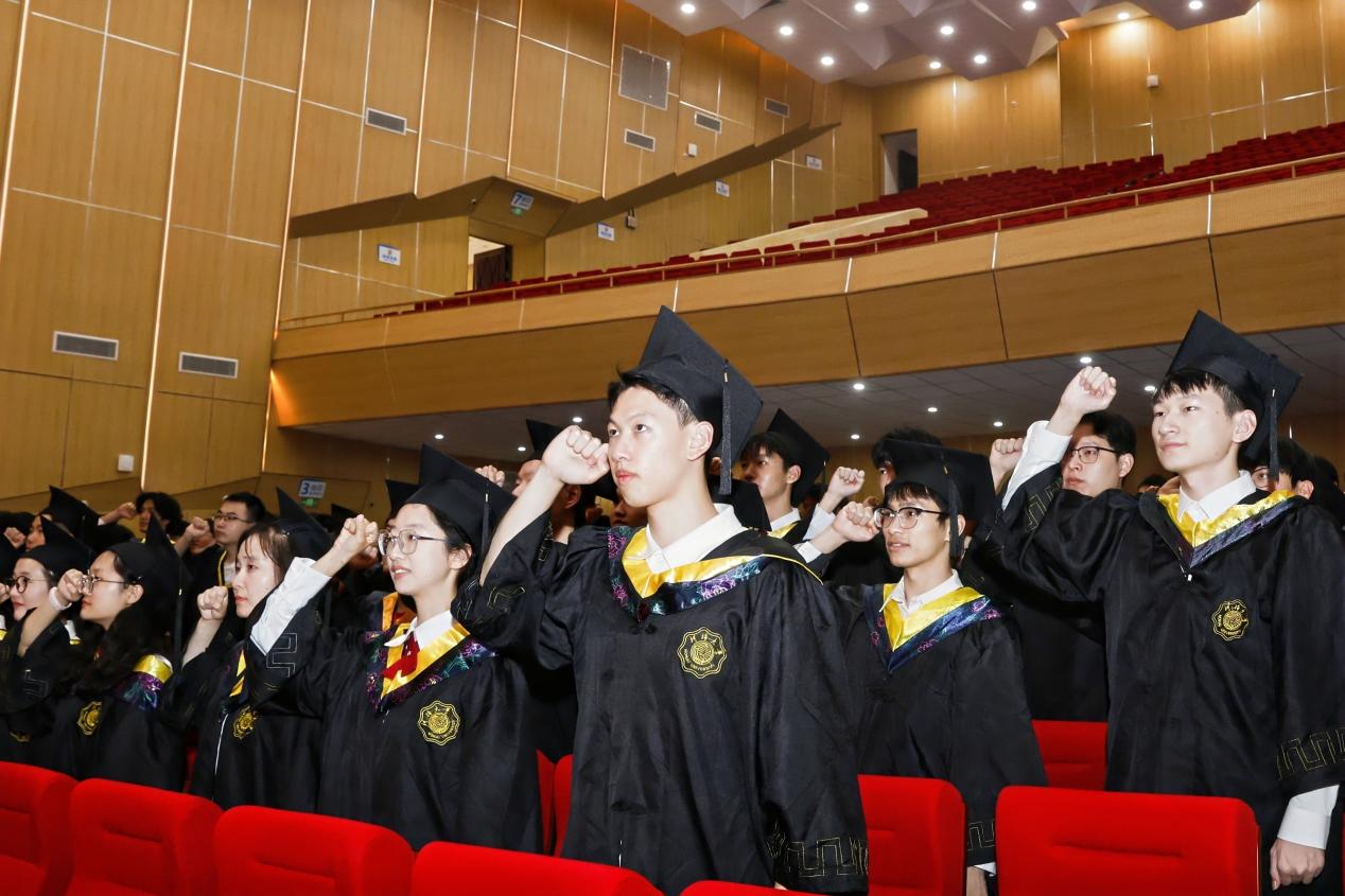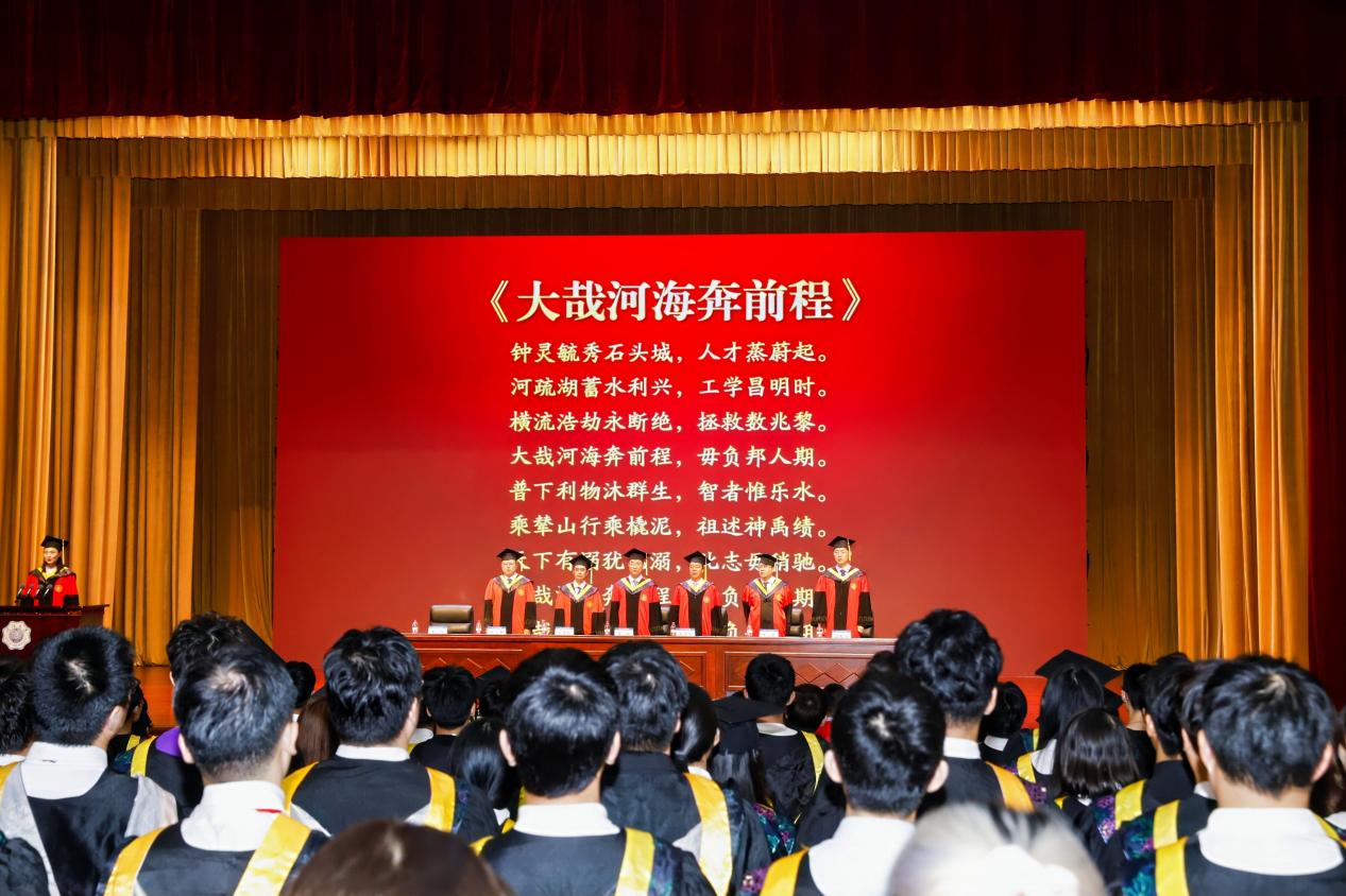 之后,全体毕业生在会场庄严宣誓。2021级硕士生范琦琦领誓,誓要情系河海,心系港航;勇立潮头,敢为人先,为我国水利事业建设奋斗终身。响亮的誓词在河海会堂上空回荡。