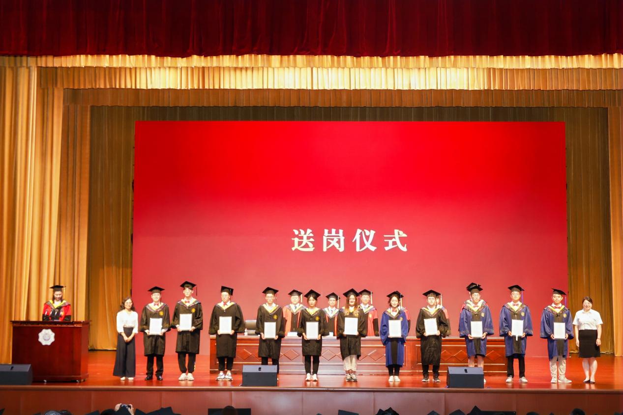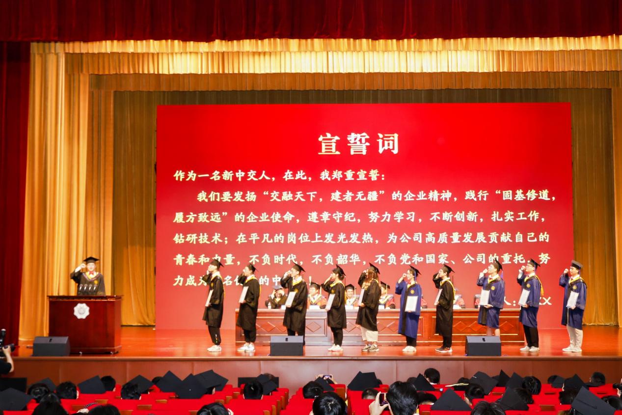 典礼面向即将入职中交系统的毕业生代表特别设置送岗仪式。中交三航局宁波分公司党委组织部部长、人力资源部经理李曼、中交三航局第三工程有限公司党委组织部、人力资源部副经理王珍为新入职的毕业生代表颁发录用意向书,11名毕业生在2020级本科生苏旭的带领下郑重宣誓。