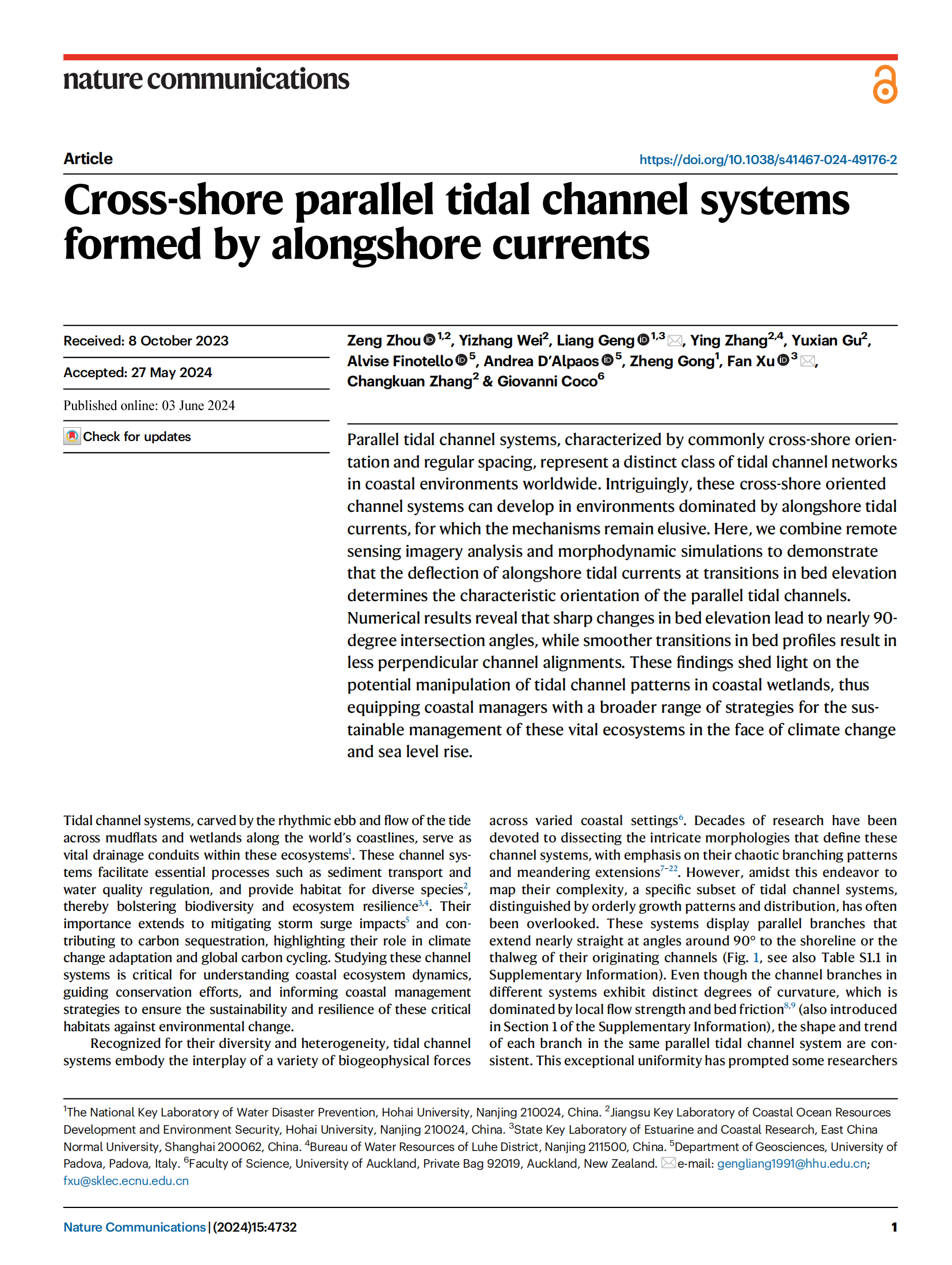海岸带资源与环境研究所周曾教授、龚政教授、张长宽教授、耿亮博士、张颖硕士、韦以璋博士生、谷玉先博士生和华东师范大学徐凡副研究员、奥克兰大学Giovanni Coco教授、帕多瓦大学Andrea D’Alpaos教授、Alvise Finotello博士共同完成,研究成果在学术期刊《Nature Communications》上发表了题为“Cross-shore parallel tidal channel systems formed by alongshore currents”的研究论文(//www.nature.com/articles/s41467-024-49176-2)。该研究得到了国家重点研发计划项目“典型海岸侵蚀防护与活力海岸构建关键技术(2022YFC3106201)”的资助,对于深入理解海岸地貌系统演变机制、评估海岸生态环境对气候变化的响应规律等具有重要意义。