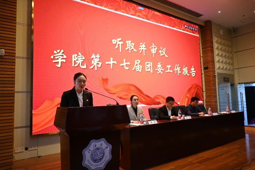 港航团委廖芳艺书记代表第十七届团委作工作报告,全面总结了过去五年学院共青团在思想引领、素质拓展、权益服务、组织提升等方面所做的工作以及取得的成绩,并展望了学院共青团未来发展规划。