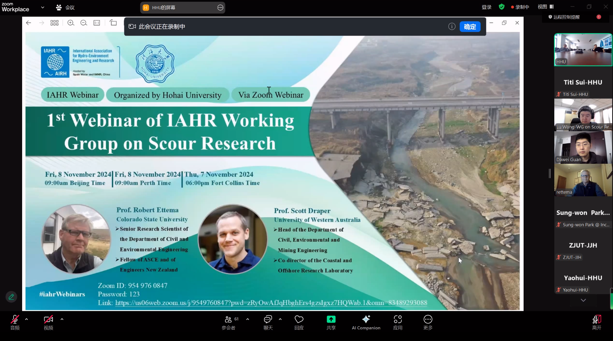 2024年11月8日,草莓视频 成功举办国际水利与环境工程学会(IAHR)冲刷研究工作组首次线上学术研讨会(1st Webinar of IAHR Working Group on Scour Research)。
