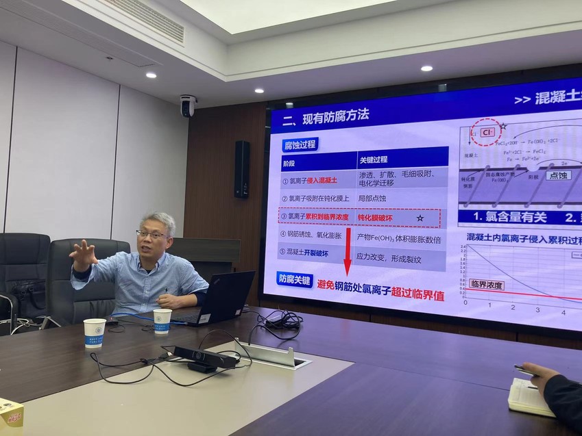 梅国雄教授详细介绍了反渗饱和技术构思、主动防腐机理、氯离子受控运移模型,以及技术有效性验证;并针对技术应用问题展开讨论,包括技术应用对象、管路设计、水头设计、耗水量估算、荷载作用综合分析,以及风险评估等,为海工混凝土结构防腐设计提供了全新的思考与解决方案。