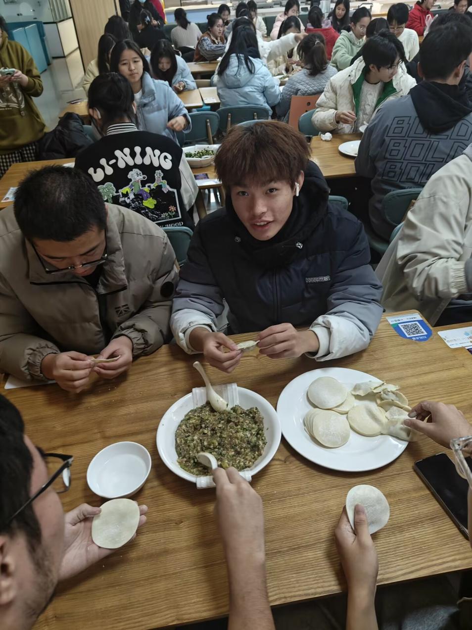 活动伊始,几位擅长包饺子的同学率先示范,他们手法娴熟,动作流畅。只见他们拿起一张饺子皮,放上适量的馅料,然后轻轻一捏一折,一个精致饱满的饺子就呈现在大家眼前,引得周围的同学阵阵赞叹。在他们的示范下,其他同学也迫不及待地开始动手尝试。有的同学有一定的包饺子基础,很快就进入了状态,包出的饺子有模有样;而有的同学则是初次尝试,略显生疏,但他们认真学习,逐渐掌握了技巧,包出的饺子也越来越像样。现场欢声笑语不断,大家一边包饺子,一边交流着家乡的冬至习俗和校园生活趣事,气氛十分融洽。