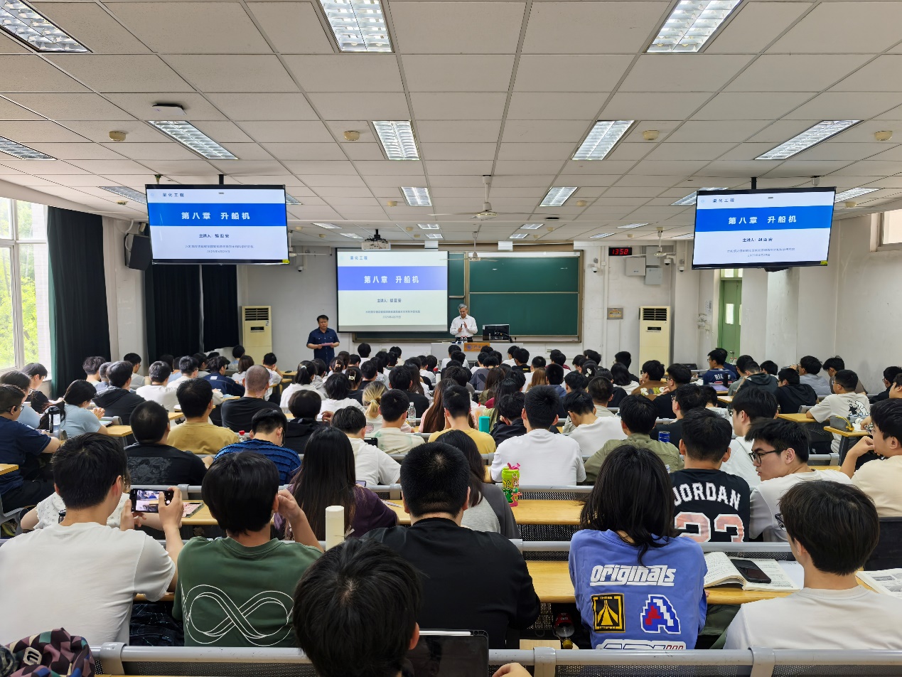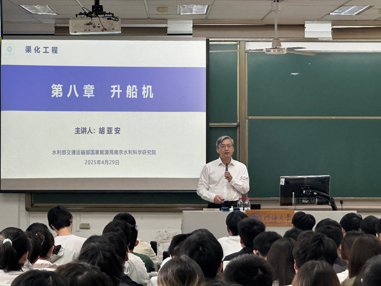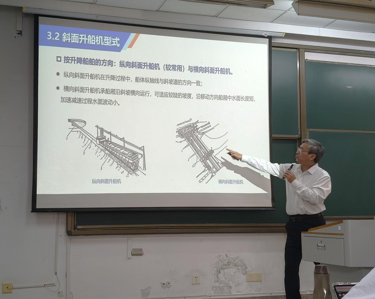 课堂上,胡亚安院士从实际工程案例切入,深入剖析了水运工程的设计理念与技术创新,并通过国内外典型工程对比,阐述了我国在渠化工程领域取得的突破性进展。他结合自身丰富的科研实践经验,运用三维模型动画和工程实景图片,以生动形象的方式将复杂的机械原理娓娓道来。授课内容既立足教材,又融入大量工程实例,使抽象的理论知识与具体的工程实践紧密结合。