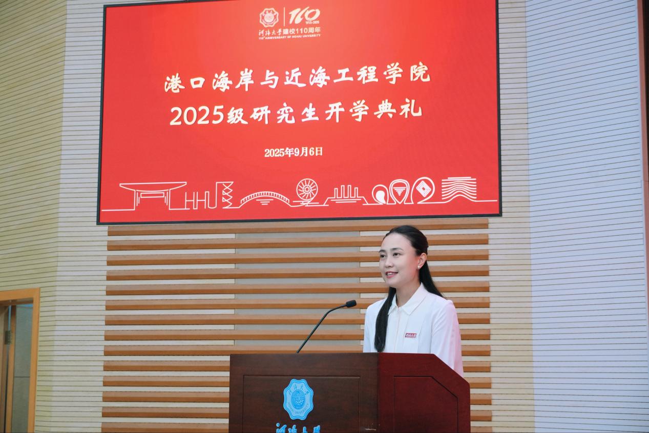 新生代表、2025级直博生吕舒纯表示,来自各地的新生因关切祖国水运与海岸带发展汇聚河海,草莓视频 对大家而言既是学业新起点,也是精神“归乡”。吕舒纯分享自身对港航工程的探索经历,强调港口海岸与近海工程需“力系自然、理实交融”,呼吁同学以校训为指引,助力民族复兴。