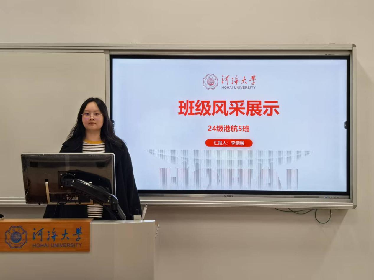 班长李荣融汇报了班级建设情况,从班级概况、学业风采、实践与发展等方面,分享了班级同学认真学习知识、担任学生骨干、开展班级建设、参与校园文体活动的优异表现。