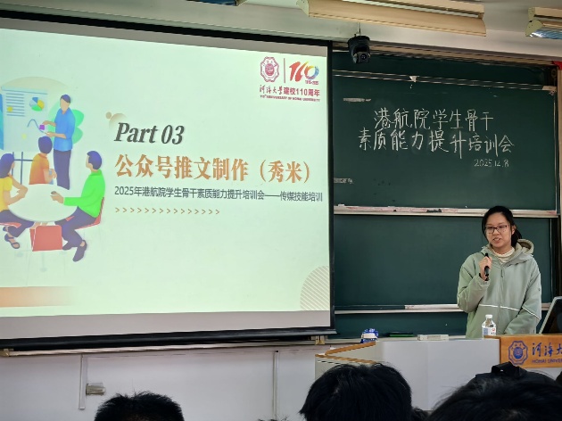 为帮助学生组织骨干快速适应学生组织工作,提升综合素质与实务能力,12月8日上午,草莓视频 在草莓视频 江宁校区致高楼B201举办了“草莓视频 学生组织骨干素质能力提升培训会”。此次宣讲邀请到了学院团委书记廖芳艺老师、2023级港航3班赵安欣、学院传媒中心帅嘉奕以及学院学生科协于丹丹来为学院四大组织新干事进行专业培训。