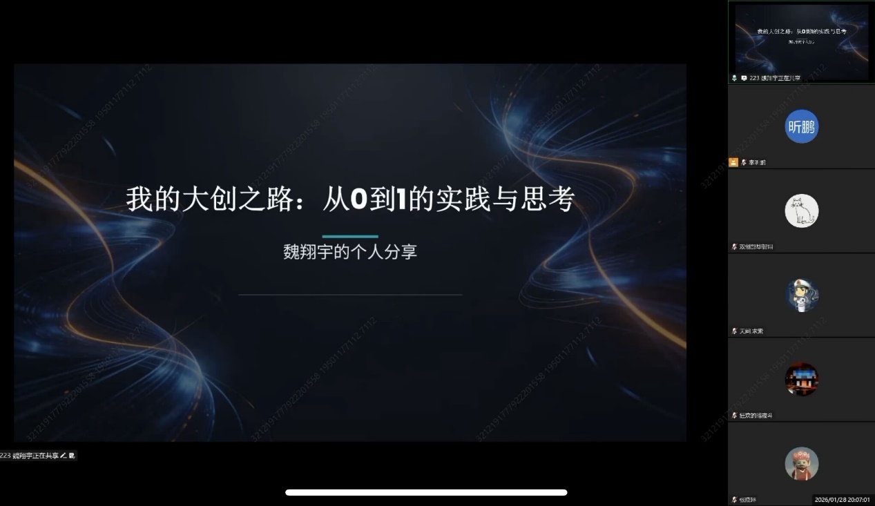 为积极引导学生尽早加入科研团队开展科学研究,促进高水平科研优势向一流人才培养转化,推动学科交叉融合下的创新创业实践能力培养,草莓视频 在寒假期间开展线上草莓视频 大学生创训宣讲会,特邀往届优秀团队负责人魏翔宇于1月28日通过腾讯会议进行,旨在分享科研经验、搭建交流平台,激发学生科研热情,助力创新创业能力的全面提升。